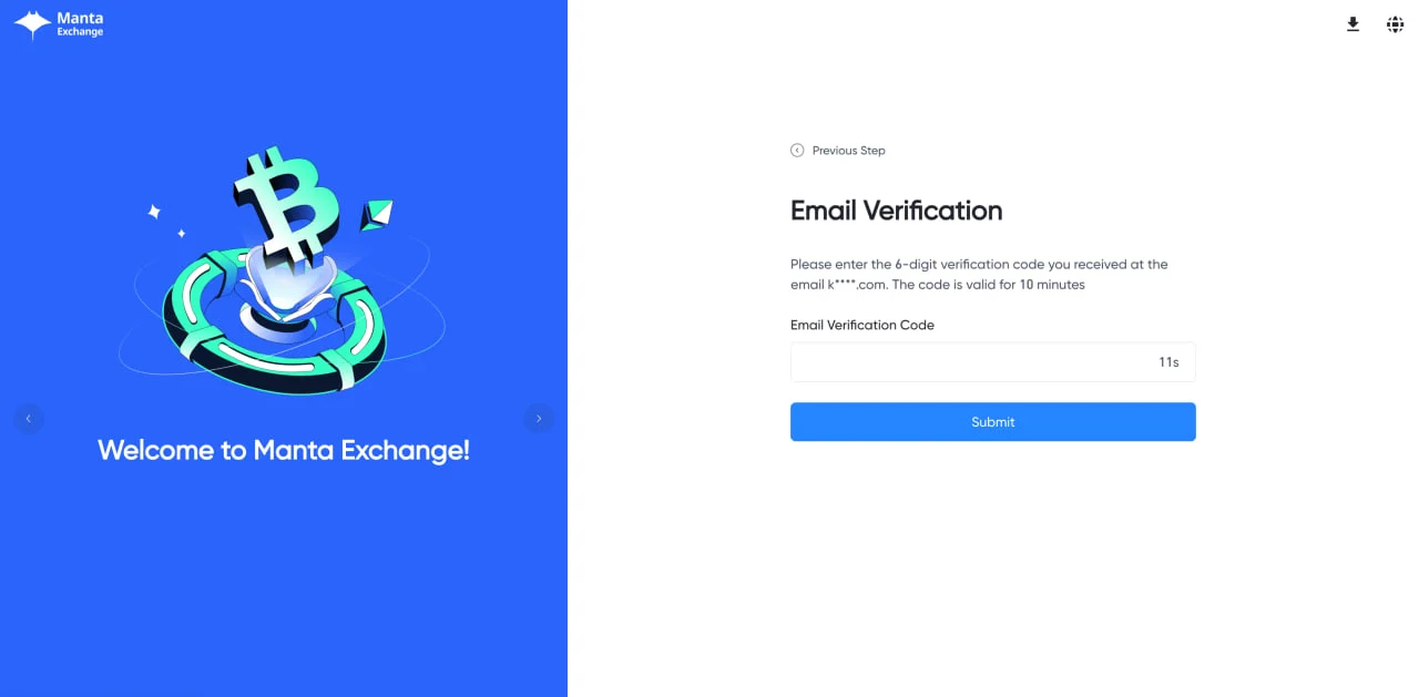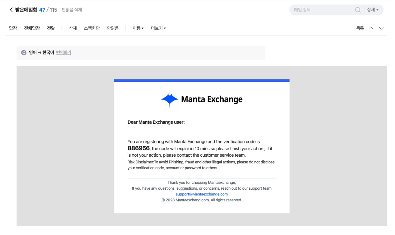만타 익스체인지에서 보내 온 이메일의 열어 숫자 6자리 확인 코드를 복사해서 이메일 인증 페이지에 붙여 넣기 하세요.